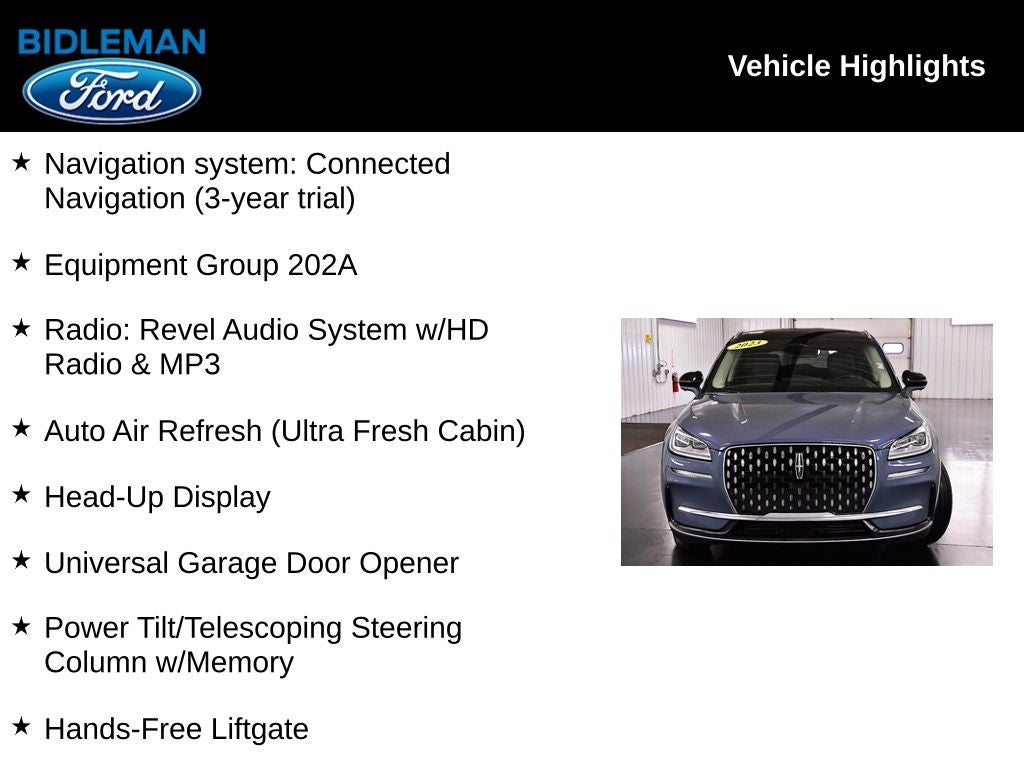 Recent Arrival! Clean CARFAX. Whisper Blue Metallic Clearcoat 2023 Lincoln Corsair Reserve AWD 8-Speed Automatic This 2023 Lincoln Corsair Reserve in Whisper Blue Metallic Clearcoat features: 21/28 City/Highway MPG 19 Bright Machined Aluminum Wheels, 60/40 EasyFold Rear Seat w/Power Seatback Release, Active Park Assist 2.0, Adaptive Suspension, All-Weather Floor Liners w/Fr&Rr Carpet Floor Mats, Alloy wheels, Auto Air Refresh (Ultra Fresh Cabin), Equipment Group 202A, Frameless Auto Dimming Rearview Mirror, Hands-Free Liftgate, Head-Up Display, Heated Rear Seat, Heated Sideview Mirrors, Heated Steering Wheel, Heated/Ventilated Driver & Front Passenger Seats, Lincoln BlueCruise 1.2, Navigation system: Connected Navigation (3-year trial), Panoramic Vista Roof w/Power Shade, Phone As A Key (PAAK), Power Liftgate, Power Tilt/Telescoping Steering Column w/Memory, Radio: Revel Audio System w/HD Radio & MP3, Rain Sensing Wipers, Spoiler, Universal Garage Door Opener, Windshield Wiper De-Icer, Wireless Charging Pad.