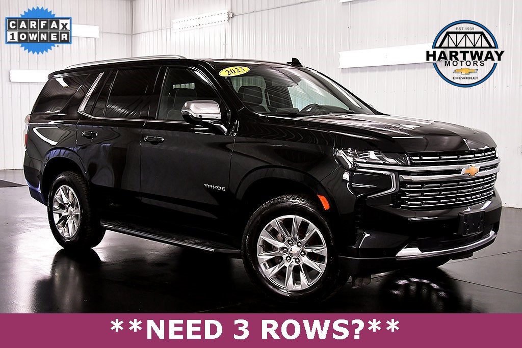 Recent Arrival! CARFAX One-Owner. Clean CARFAX. Black 2023 Chevrolet Tahoe Premier 4WD 10-Speed Automatic with Overdrive This 2023 Chevrolet Tahoe Premier in Black features: 1st & 2nd Row Color-Keyed Carpeted Floor Mats, 2-Speed Active Electronic AutoTrac Transfer Case, 3rd Row 60/40 Power-Folding Split-Bench Seat, Advanced Trailering Package, Auto-Dimming Inside Rear-View Mirror, Bose 10-Speaker Centerpoint Surround Audio Sys Ft, Bright Front & Rear Door Sill Plates, Chrome Door Handles w/Body-Color Strip, Chrome Mirror Caps, Color-Keyed Carpeting Floor Covering, Driver & Front Outboard Passenger Airbags, Dual Exhaust System, Enhanced Driver Information Center, Extra Capacity Cooling System, Floor Console, Hands-Free Rear Power Programmable Liftgate, Heated 2nd Row Outboard Seats, Heated Steering Wheel, Hill Descent Control, Hitch Guidance w/Hitch View, Infotainment Display, Integrated Trailer Brake Controller, Lane Change Alert w/Side Blind Zone Alert, LED Daytime Running Lamps, Max Trailering Package, Memory Settings, Outside Heated Power-Adjustable Mirrors, Power Release 2nd Row Bucket Seats, Power Tilt & Telescopic Steering Column, Preferred Equipment Group 1LZ, Rear Cross Traffic Alert, Remote Start, Safety Alert Seat, SiriusXM Radio w/360L, Smart Trailer Integration Indicator, Trailer Side Blind Zone Alert, Universal Home Remote, Wireless Charging, Wrapped Steering Wheel.