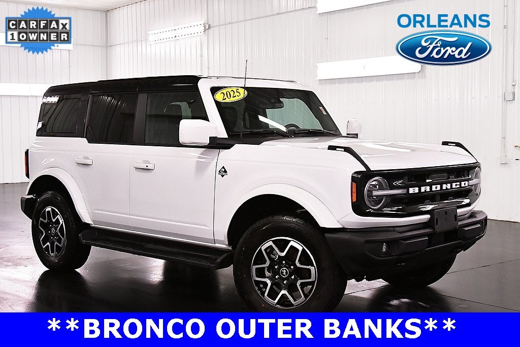 Recent Arrival! CARFAX One-Owner. Clean CARFAX. Oxford White 2025 Ford Bronco Outer Banks 4WD 10-Speed Automatic This 2025 Ford Bronco Outer Banks in Oxford White features: 18 Bright Machined Aluminum Wheels, 3.73 Axle Ratio, Equipment Group 312A Mid Package.